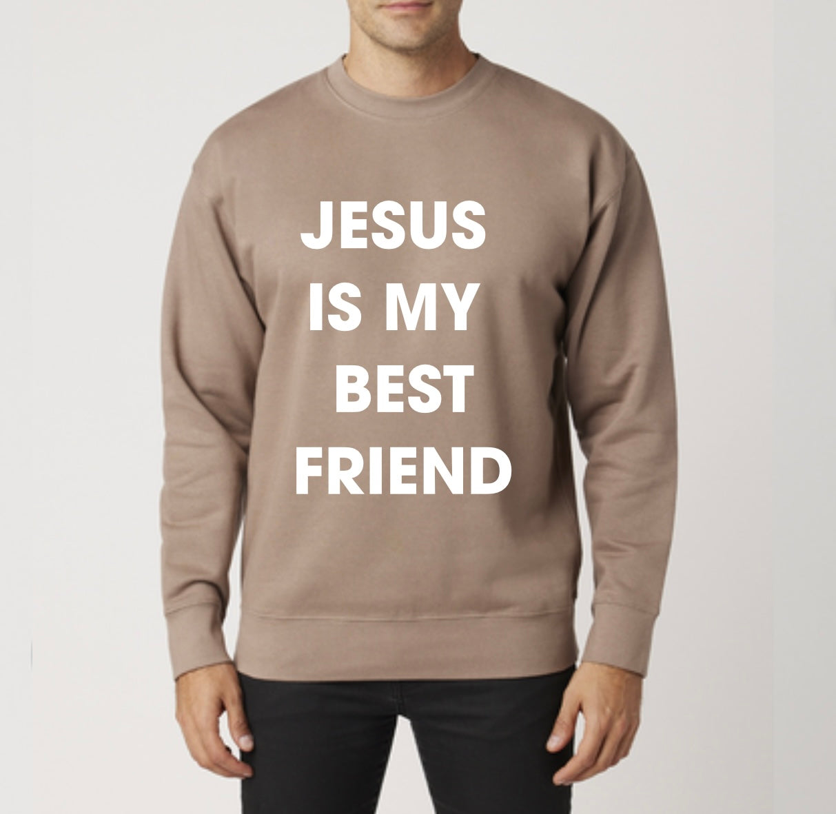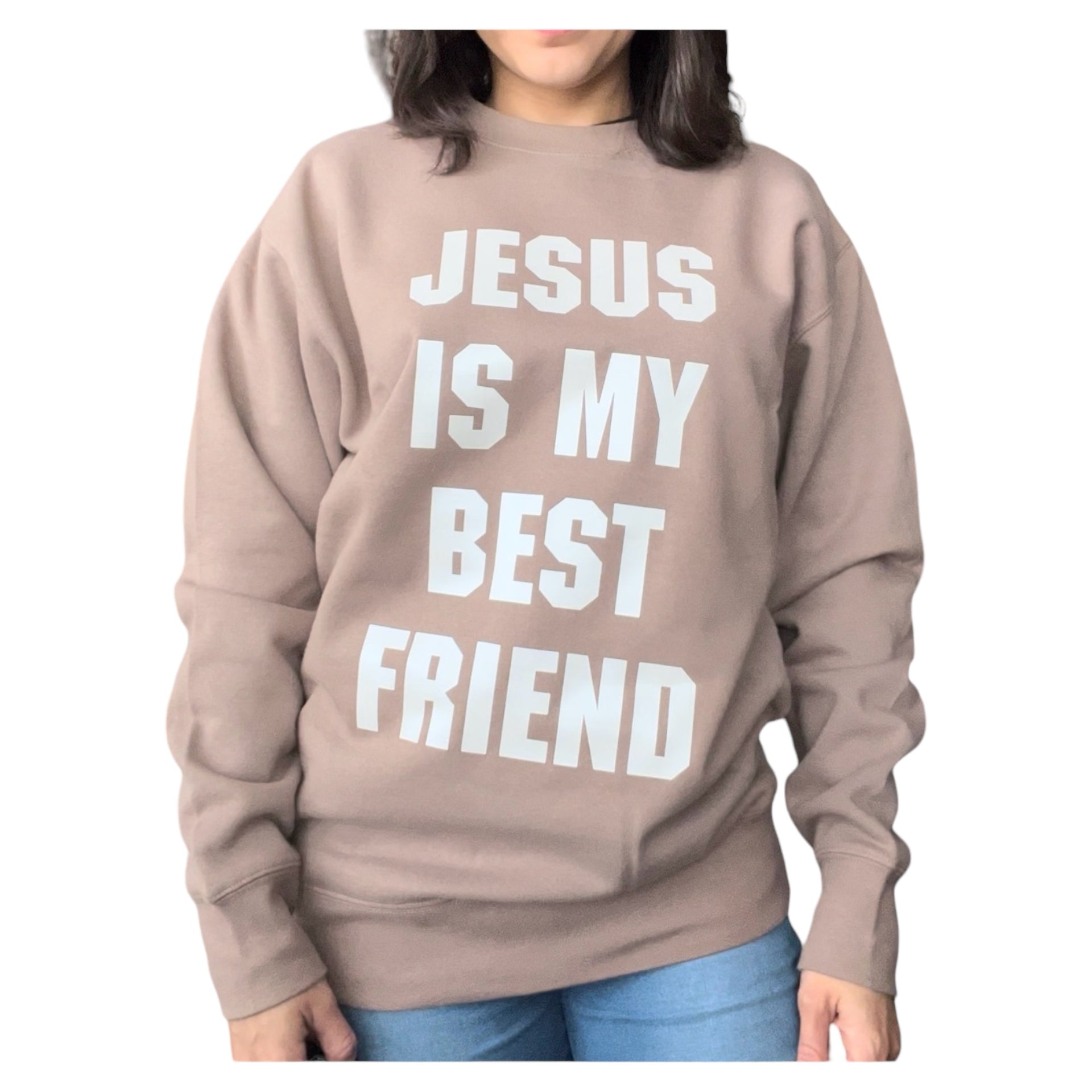 Stay warm and stylish with our Jesus Is My Best friend sweatshirt. Made from 100% premium cotton, it's not only comfortable but also a reminder of the love and friendship we have with Jesus. Available in a beautiful latte color. Spread the message and show your faith in a fashionable way.