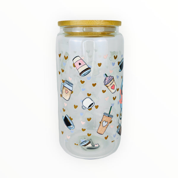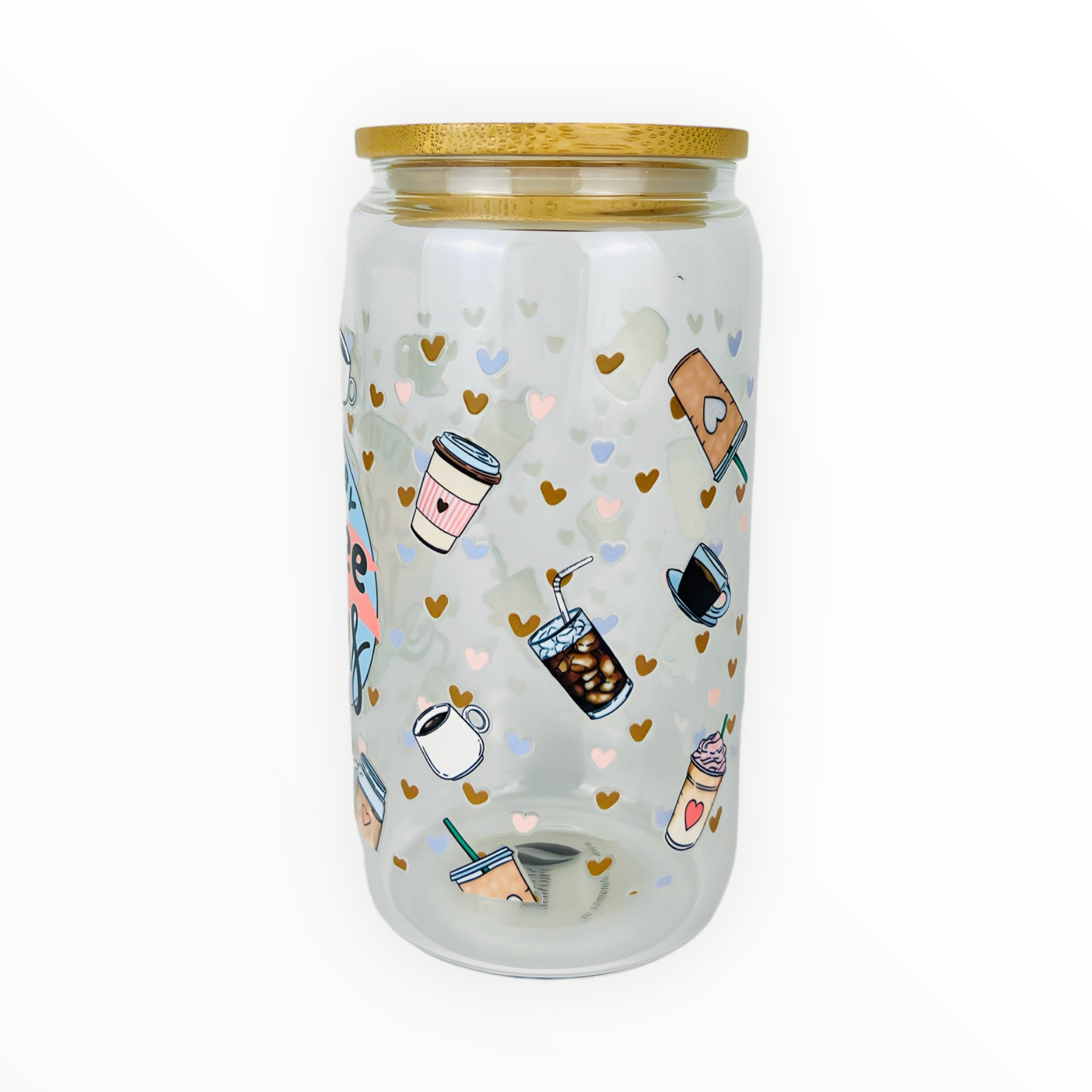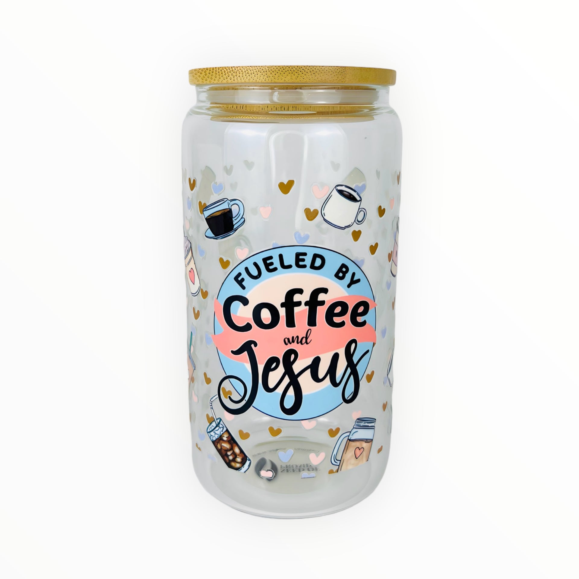 Glass Cup Fueled by Coffee and Jesus 16 oz with two glass straws